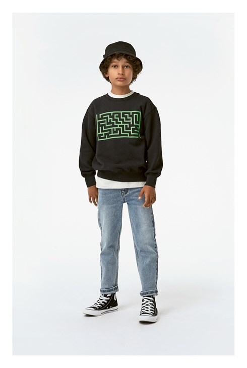 Vind je weg door het groene doolhof dat op de voorkant van het Mann trui is gedrukt. Mann is een zwart trui met ribboord aan de mouwen en onderkant.