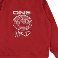 Mann is een rode sweater met een print van planeet Aarde en de tekst 'One World'. Het heeft een ronde hals en elastische ribboorden aan de mouwen en onderkant.