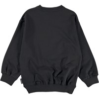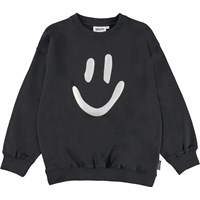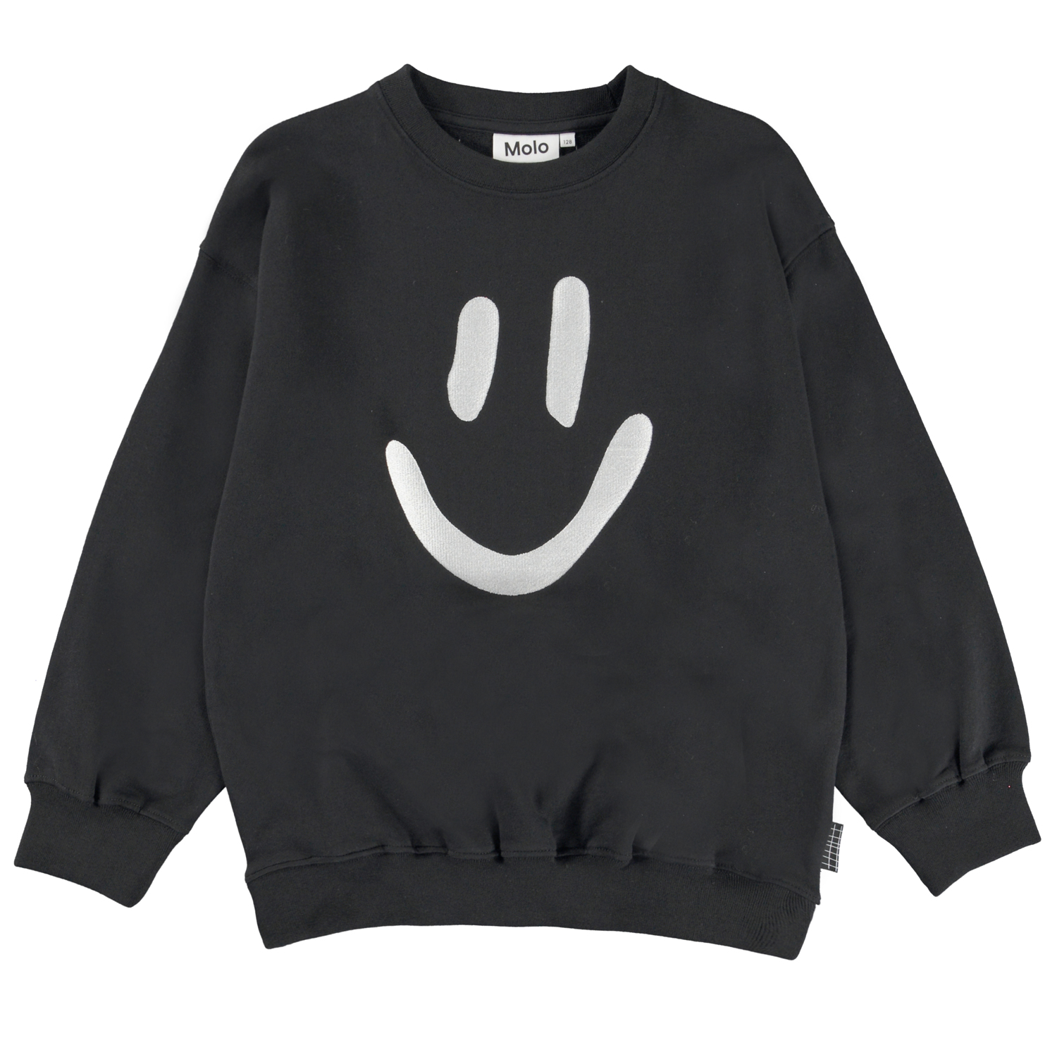 Mar is een zwarte sweater met op de voorkant een print van een smiley.