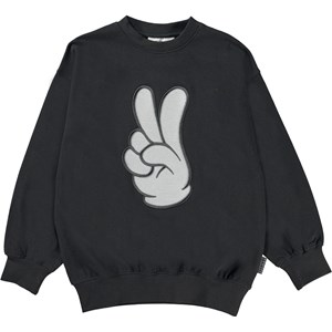 Mar is een zwarte trui met een stukje van een hand, dat een vredesteken vormt. De trui heeft ribboord rond de hals, mouwen en onderkant.
