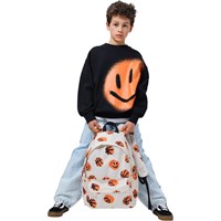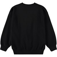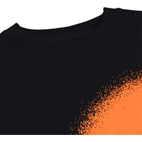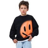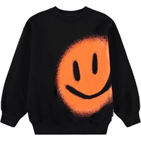 Zwarte sweater gemaakt van zacht, biologisch katoen met een ronde hals en ribboorden rond de mouwen, hals en onderkant. De sweater heeft een ruime en relaxte pasvorm en op de voorkant een oranje print van een lachend gezicht.