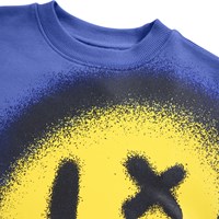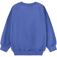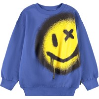 Blauwe sweater gemaakt van zacht biologisch katoen met een gele glimlachprint. De sweater heeft ribboorden rond de hals, mouwen en taille. De sweater heeft een ruimvallende pasvorm.
