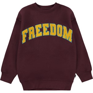 Bordeauxrode sweater met op de voorkant een groot borduurwerk. Het blauwe en gele borduurwerk spelt FREEDOM. Deze sweater is gemaakt van 100% katoen, heeft een ronde hals met een ribboord, een ribboord aan de mouwen en onderkant en het heeft een ruimvallende pasvorm.