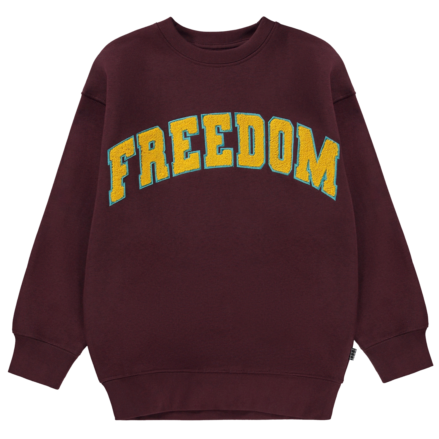 Bordeauxrode sweater met op de voorkant een groot borduurwerk. Het blauwe en gele borduurwerk spelt FREEDOM. Deze sweater is gemaakt van 100% katoen, heeft een ronde hals met een ribboord, een ribboord aan de mouwen en onderkant en het heeft een ruimvallende pasvorm.