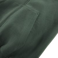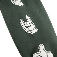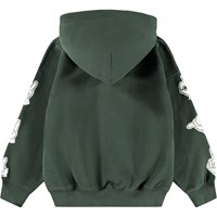 Donkergroene katoenen vest met een voorzak, een ritssluiting aan de voorkant en ribboorden rond de mouwen en taille. De vest heeft witte prints van verschillende handgebaren op de mouwen.