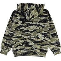 Matt is een hoodie in een camouflageprint. Het heeft een capuchon, een buidelzak aan de voorkant en 'One World' geborduurd in oranje op de borst.