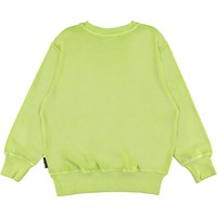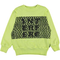Mattis is een neongroene trui met een zwarte 'Interfere' print op de voorkant.