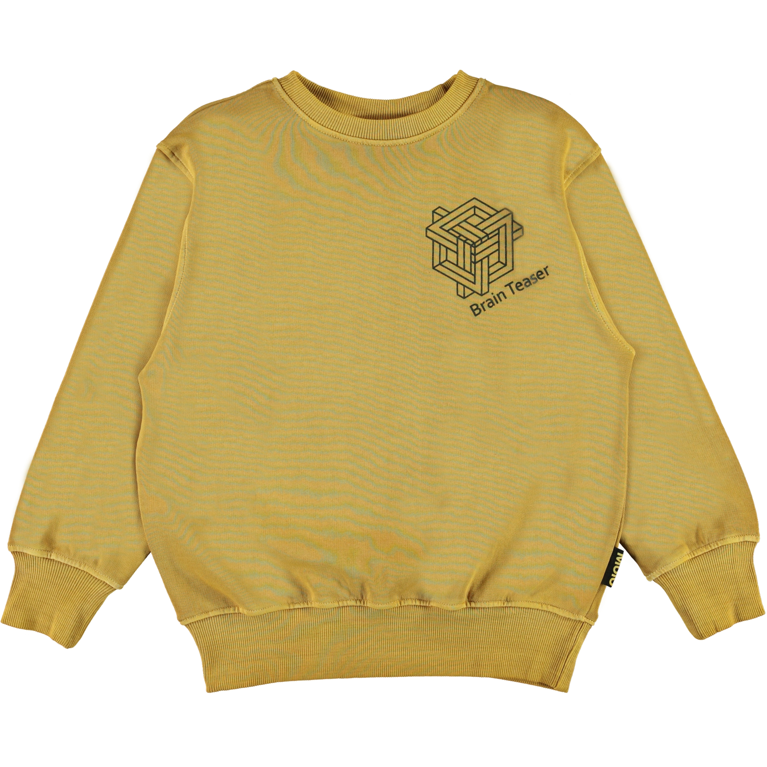 Mattis is een gouden trui met een print op de voor- en achterkant met een 'Brain teaser'.