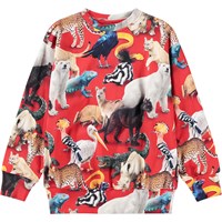 Donkergroene sweater van biologisch katoen met een ronde hals, geribbelde manchetten en zoom. De sweater heeft een normale pasvorm en een all-over print van verschillende dieren. De sweater heeft een gevoerde binnenkant, waardoor het zacht en warm is om te dragen.