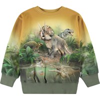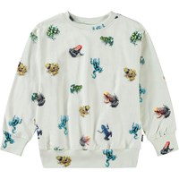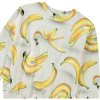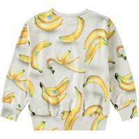 Beige sweater van zacht biologisch katoen met ribborden rond de hals, mouwen en onderkant van de sweater. De sweater heeft een normale pasvorm en een all over print van gele bananen.