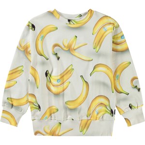 Beige sweater van zacht biologisch katoen met ribborden rond de hals, mouwen en onderkant van de sweater. De sweater heeft een normale pasvorm en een all over print van gele bananen.