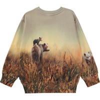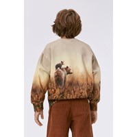 Beige sweater met op de voorkant een print. Op de print staat een berenfamilie die iets lijkt te zoeken: misschien hun vrienden of misschien een pot honing? Wat denk jij? Deze sweater is gemaakt van 100% katoen, heeft een ronde hals met een ribboord, een ribboord aan de mouwen en onderkant en het heeft een normale pasvorm.
