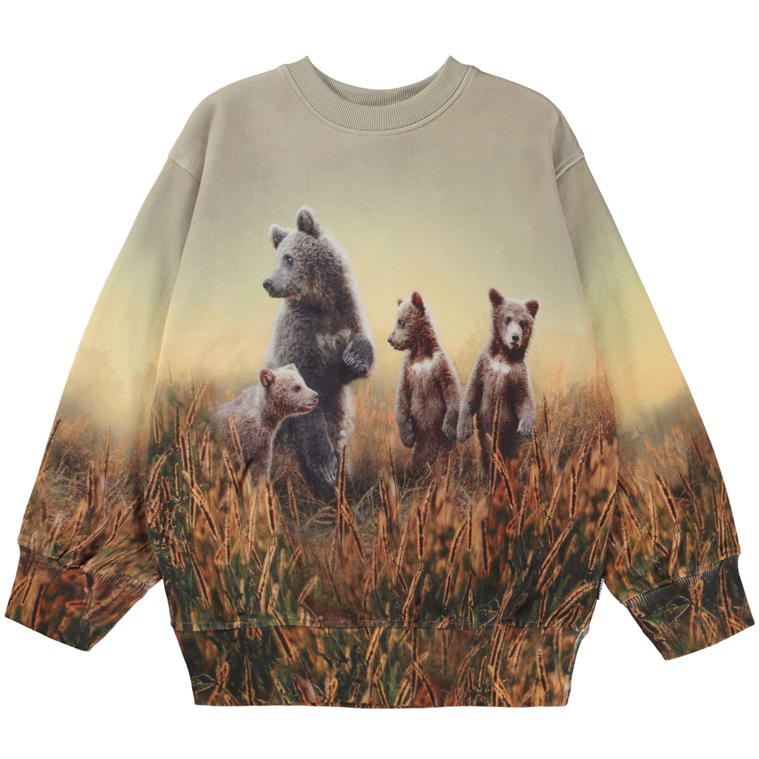 Beige sweater met op de voorkant een print. Op de print staat een berenfamilie die iets lijkt te zoeken: misschien hun vrienden of misschien een pot honing? Wat denk jij? Deze sweater is gemaakt van 100% katoen, heeft een ronde hals met een ribboord, een ribboord aan de mouwen en onderkant en het heeft een normale pasvorm.