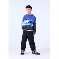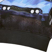 Blauwe sweater gemaakt van zacht biologisch katoen met ribboorden rond de hals, mouwen en taille. De sweater heeft een normale pasvorm en een print van een elektrische raceauto.