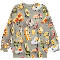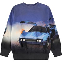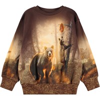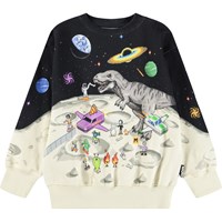 Donkere sweater gemaakt van zacht biologisch katoen met ribboorden rond de hals, mouwen en taille. De sweater heeft een normale pasvorm en een print van een dinosaurus en een prachtige lucht.