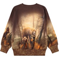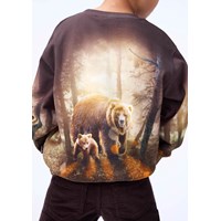 Bruine sweater gemaakt van zacht biologisch katoen met ribboorden rond de hals, mouwen en taille. De sweater heeft een normale pasvorm en een print van schattige honingberen.