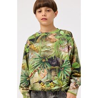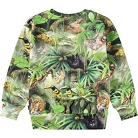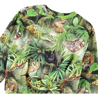 Sweater van zacht biologisch katoen met ribborden rond de hals, mouwen en onderkant van de sweater. De sweater heeft een normale pasvorm en een all over print van de groene weelderige jungle met zijn vele dieren.