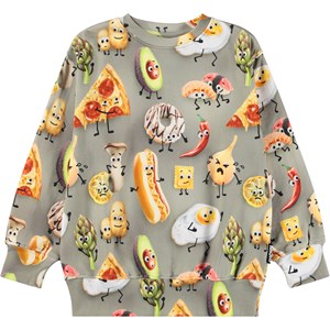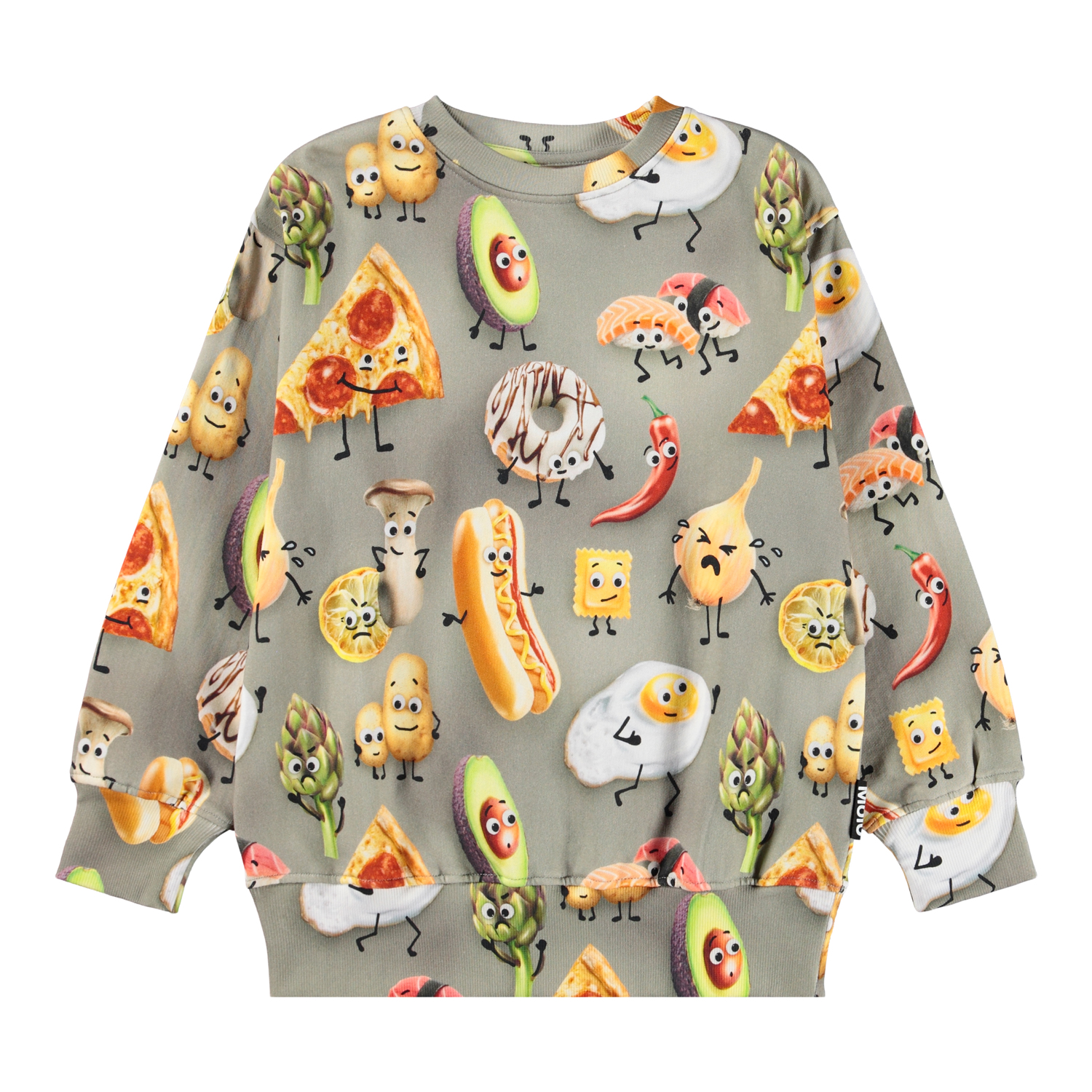 Grijze sweater gemaakt van zacht biologisch katoen met ribboorden rond de hals, mouwen en taille. De sweater heeft een normale pasvorm en een print van voedsel met gezichten.