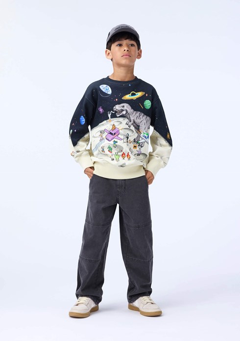 Kleurrijk sweater gemaakt van zacht biologisch katoen met ribboorden rond de hals, mouwen en taille. De sweater heeft een normale pasvorm en een pixelachtige print geïnspireerd op de computer van de maan.