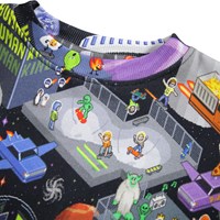 Zwarte sweater gemaakt van zacht biologisch katoen met ribboorden rond de hals, mouwen en taille. De sweater heeft een normale pasvorm en een print geïnspireerd op een pixelachtig computerspel.