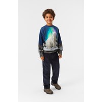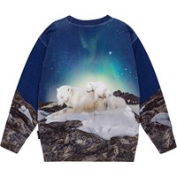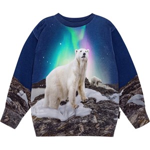 Donkerblauwe sweater van biologisch katoen met een ronde hals, geribbelde manchetten en zoom. De sweater heeft een normale pasvorm en een gevoerde binnenkant, waardoor het zacht en warm is om te dragen. De print toont de majestueuze ijsbeer moeder onder een avondlucht met prachtige noorderlicht, terwijl de ijsbeer vader en twee ijsbeerwelpen te zien zijn op de achterkant. De sneeuw onder de ijsbeer is op verschillende plaatsen gesmolten, wat ons eraan herinnert om goed voor onze prachtige planeet en alle wezens die hier leven te zorgen.
