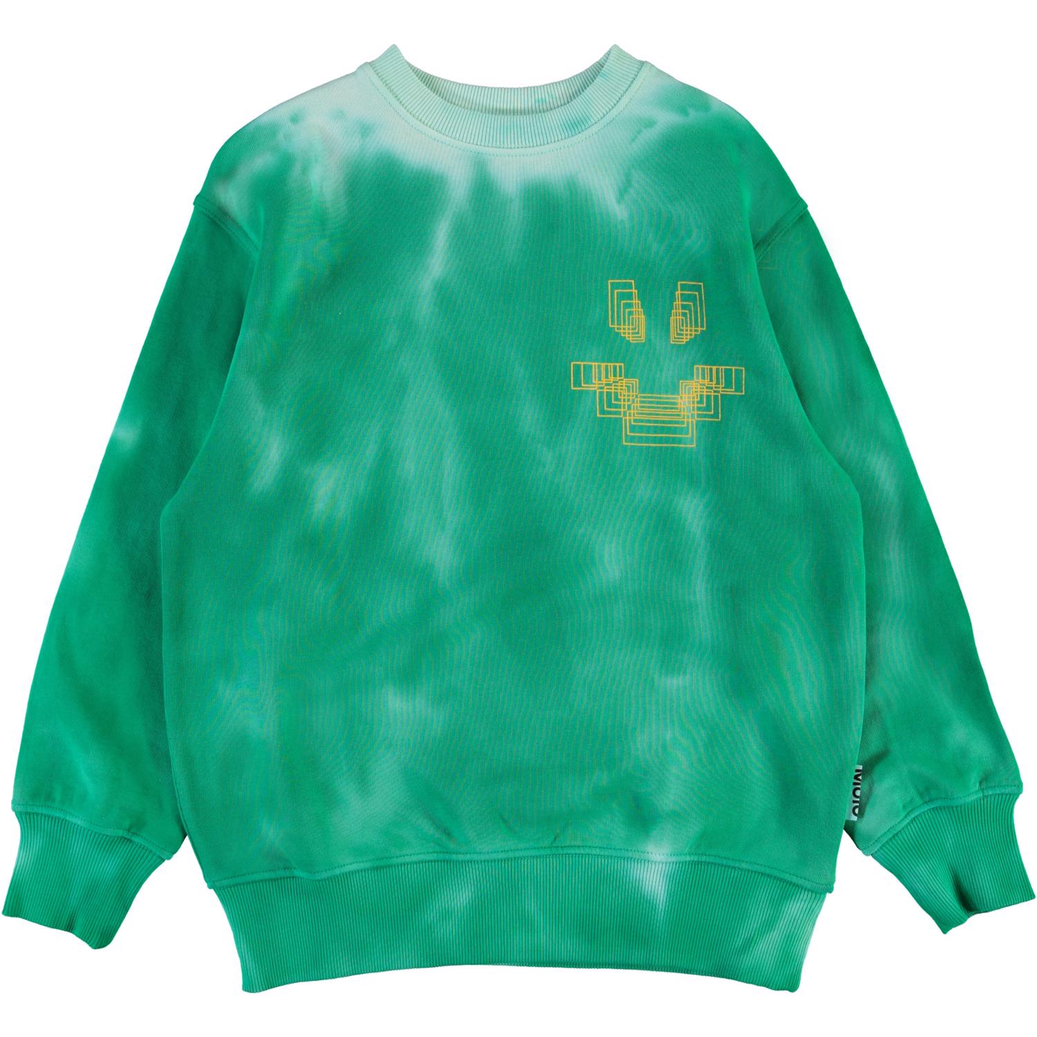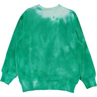 Mattis is een groene en lichtblauw tie-dye sweater met een smiley print op de borst. Het heeft een ronde hals en elastische ribboorden aan de mouwen en onderkant.