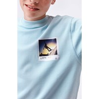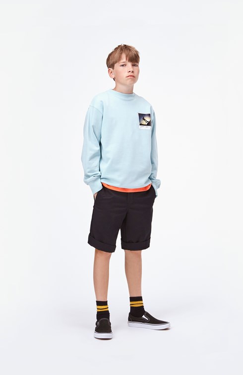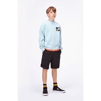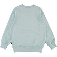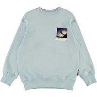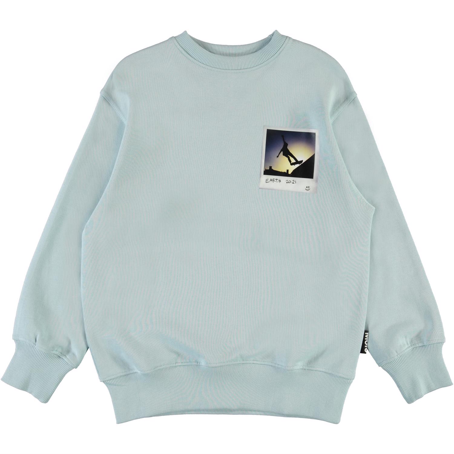 Mattis is een lichtblauw sweater met een kleine print van een skater bij zonsondergang op de borst. Het heeft een ronde hals en elastische ribboorden aan de mouwen en onderkant.