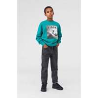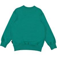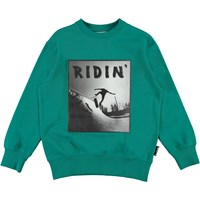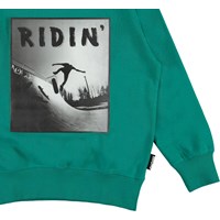 Mattis is een groene sweater met, op de voorkant, een print van een skater en de tekst ‘ridin’.