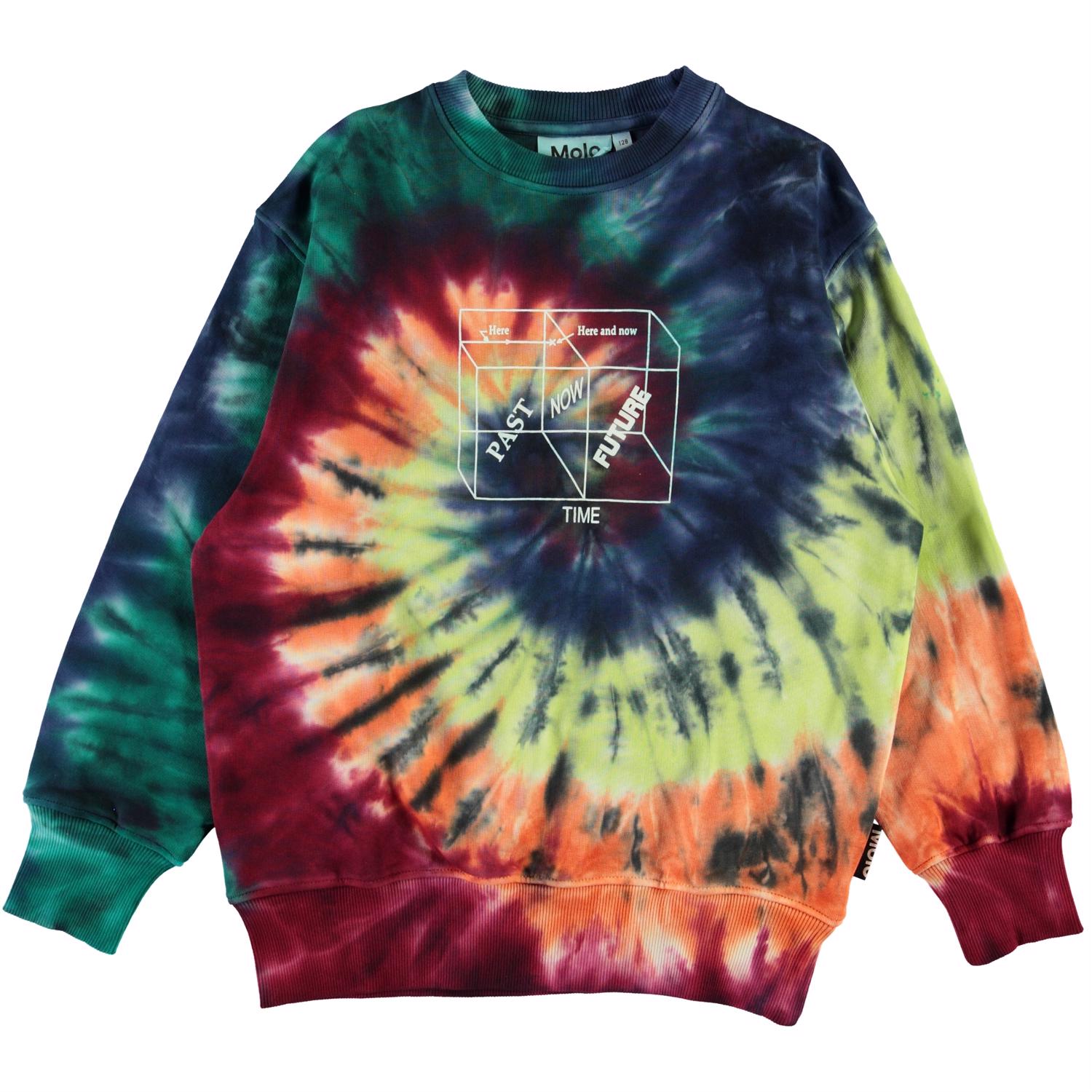 Mattis is een kleurrijk tie-dye trui, waarbij de kleuren een spiraal vormen. de trui heeft ook een print op de voorkant van het verleden (past), heden (now) en toekomst (future).