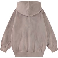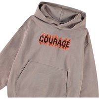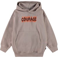 Lichtbruine oversized hoodie van zacht biologisch katoen met voorzak en ribboord. Op de voorkant van de hoodie staat de tekst 'Courage' in vlammende letters.