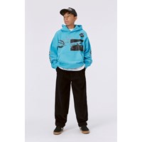 Turquoise blauwe hoodie met een grafische print. De print is een combinatie van verschillende heelal geïnspireerde elementen zoals satellieten, de fasen van de maan en verduisteringen. De print heeft een grafische uitstraling, met iconen, teksten en grafische foto's, in drie verschillende tinten. Deze hoodie is gemaakt van 100% katoen, heeft een buidelzak, ribboorden aan de mouwen en onderkant en het heeft een oversized pasvorm.