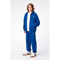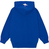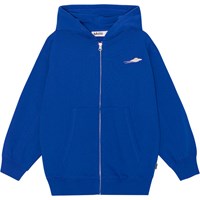 Blauwe hoodie met ritssluiting. Op de voorkant van de capuchon en op de borst staat een kleine print van een witte UFO. De hoodie heeft een ritssluiting aan de voorkant, een buidelzak en ribboord rond de mouwen en de onderkant. Dit model heeft een zeer ruimvallende pasvorm. Als je een meer klassieke pasvorm wilt, of als je kind tussen twee maten in zit, raden we je aan een maat kleiner te kiezen dan normaal.