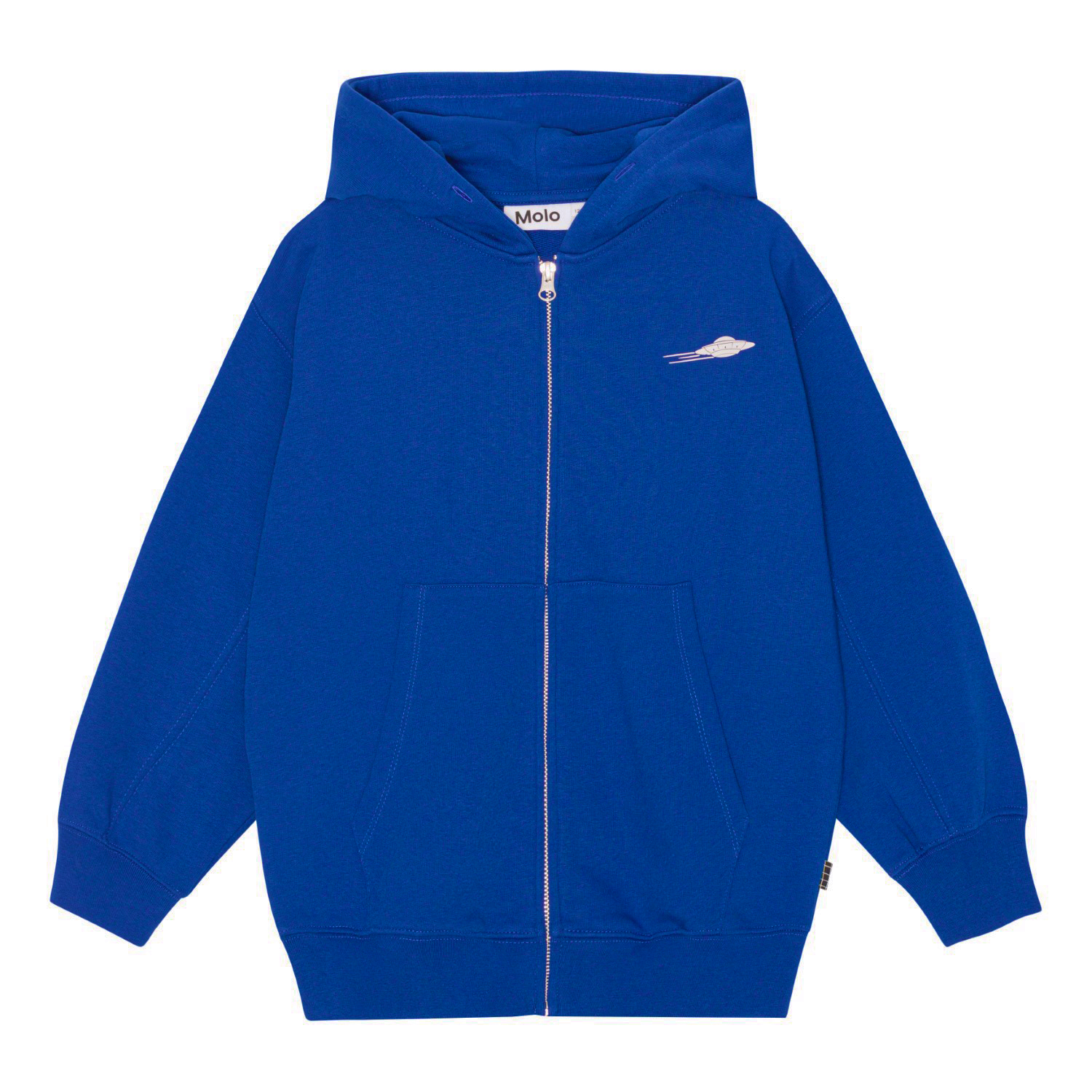 Blauwe hoodie met ritssluiting. Op de voorkant van de capuchon en op de borst staat een kleine print van een witte UFO. De hoodie heeft een ritssluiting aan de voorkant, een buidelzak en ribboord rond de mouwen en de onderkant. Dit model heeft een zeer ruimvallende pasvorm. Als je een meer klassieke pasvorm wilt, of als je kind tussen twee maten in zit, raden we je aan een maat kleiner te kiezen dan normaal.