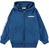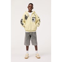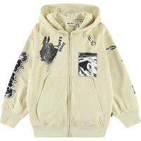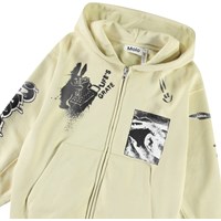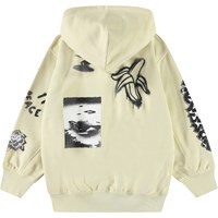 Gebroken witte hoodie van zacht biologisch katoen met rits en voorzakken en ribboord rond de mouwen en onderkant. De hoodie heeft een ruimvallende pasvorm met kleine zwarte prints van de thema's van de collectie over genieten van het leven. Voor een complete set combineer jet het met de bijpassende shorts.