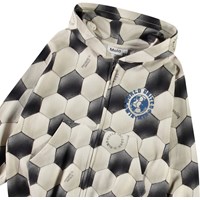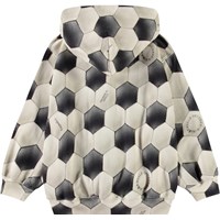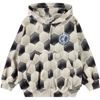 Hoodie van zacht biologisch katoen met rits en voorzakken en ribboord rond de mouwen en onderkant. De hoodie heeft een ruimvallende pasvorm met een all over print van een voetbalpatroon in beige en zwart en een logo op de borst. Voor een complete set combineer jet het met de bijpassende shorts.