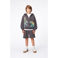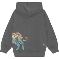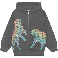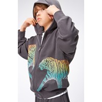 Grijze hoodie met ritssluiting en een print. De print is in een coole jaren 80 sfeer, met regenboogkleuren in de vacht van de twee tijgers die opduiken tegen de donkere achtergrond. De hoodie heeft geen zijnaden, waardoor het motief doorloopt rond het lichaam. De hoodie heeft een ritssluiting aan de voorkant, een buidelzak en ribboord rond de mouwen en de onderkant. Dit model heeft een zeer ruimvallende pasvorm. Als je een meer klassieke pasvorm wilt, of als je kind tussen twee maten in zit , raden wij u aan een maat kleiner te kiezen dan normaal.
