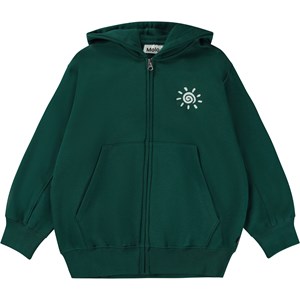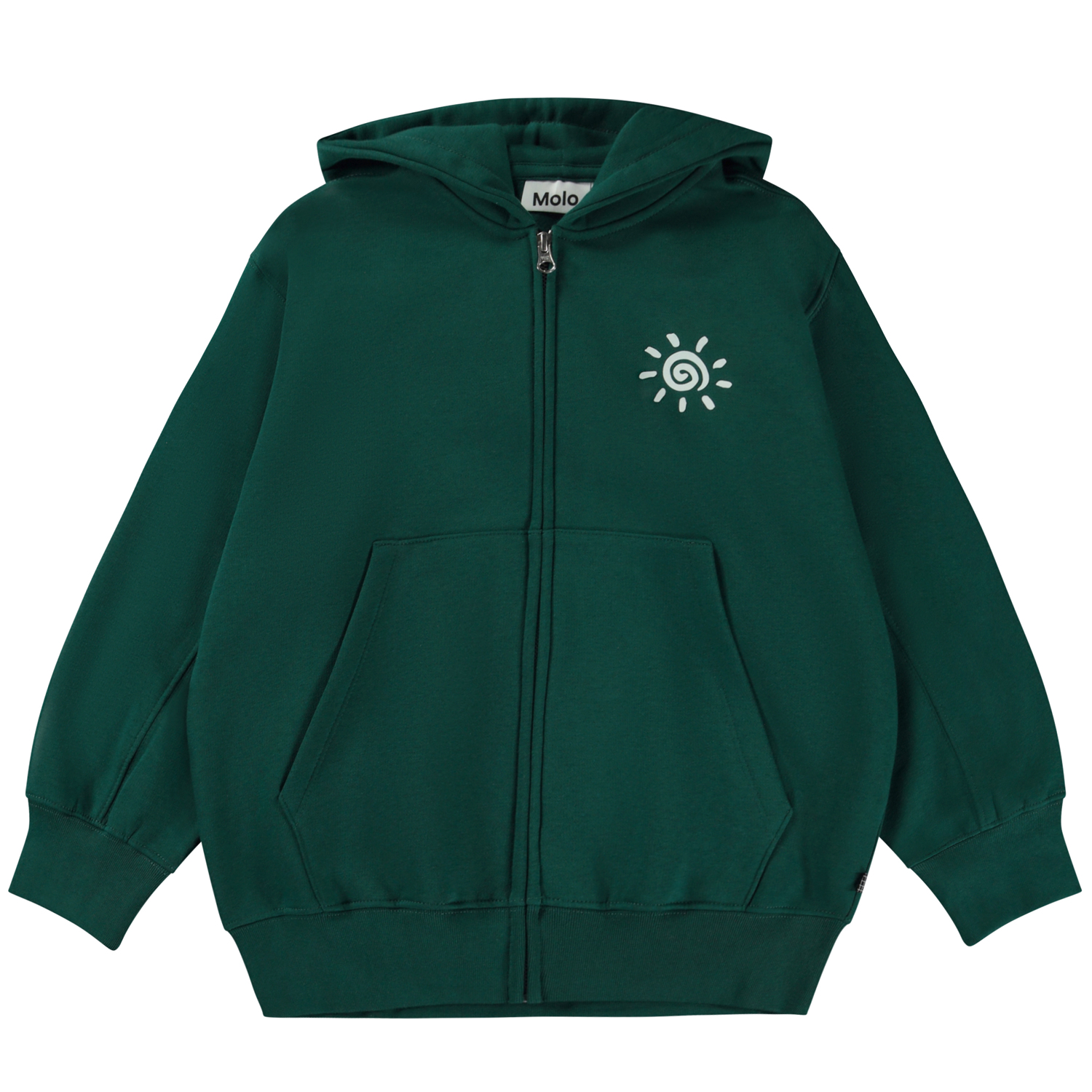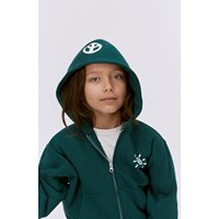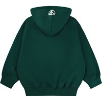 Donkergroene hoodie met een witte grafische print. De print is een zon op de voorkant en een peace teken op de voorkant van de capuchon. De twee printen verwijzen naar twee hoofdthema's van de collectie: "Under the same Sun" en "Peace". Deze hoodie is gemaakt van 100% katoen, heeft een ritssluiting en een buidelzak. Het heeft ribboord aan de mouwen en onderkant en het heeft een ruimvallende pasvorm. Voor een perfecte set draag je de hoodie met de bijpassende Adian short die van dezelfde kleur is.