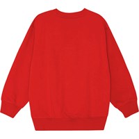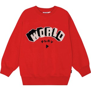 Rode sweatshirt van biologisch katoen met een gevoerde binnenkant, waardoor het zacht en warm is om te dragen. De sweater heeft een normale pasvorm, een ronde hals, geribbelde boorden en een geplaatste borduursel aan de voorkant met de tekst "World Play" in zwart, wit en gebroken witte kleuren.