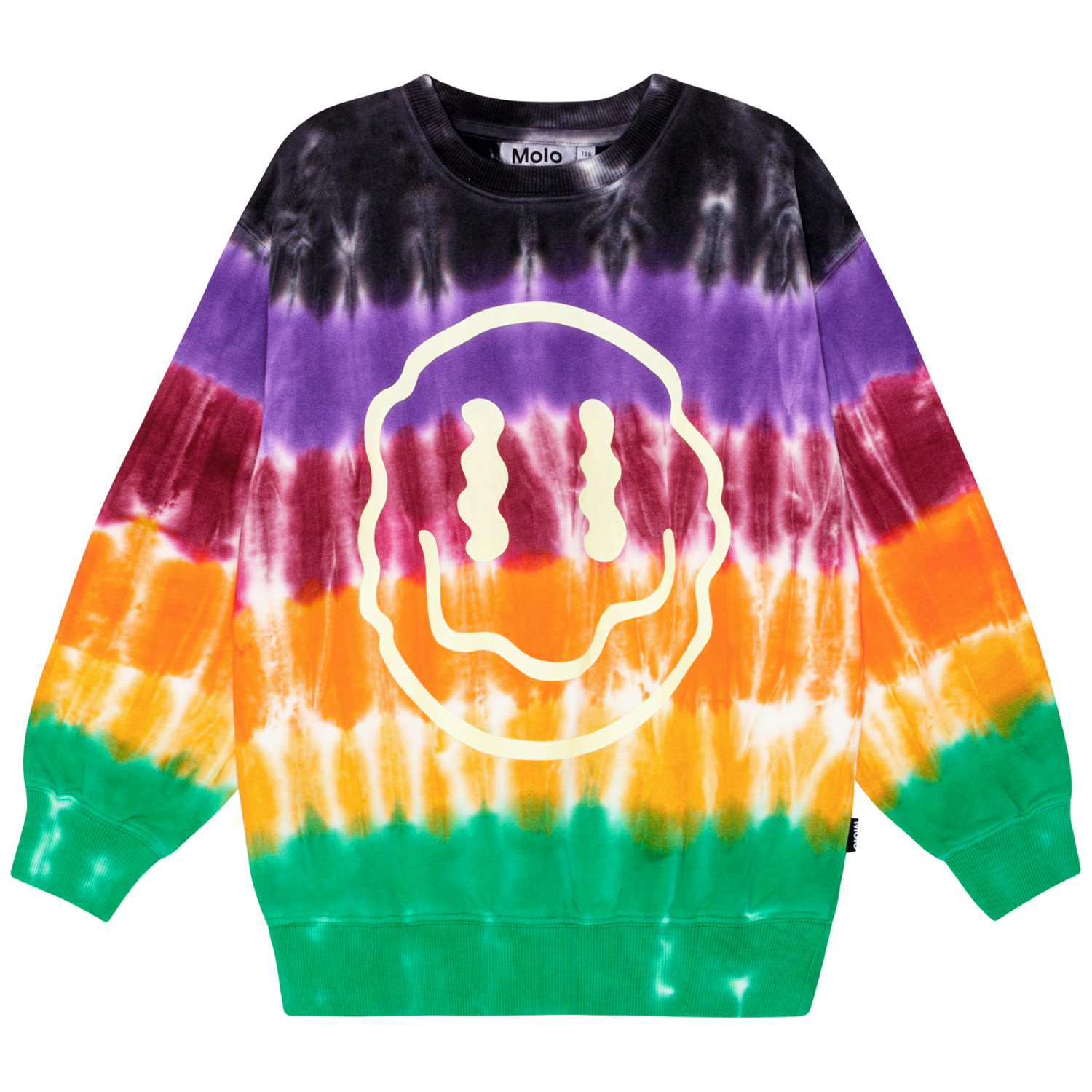 Kleurrijke sweater in tie-dye en biologisch katoen met een ronde hals, geribbelde zoom rond de taille en mouwen. De sweater heeft een normale pasvorm en een gevoerde binnenkant, waardoor het zacht en warm is om te dragen. Geplaatste print op de voorkant van een grote glimlachende smiley, waardoor een glitch-effect ontstaat.
