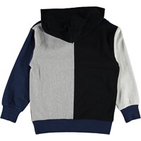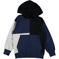 Meqo is een patchwork achtige hoodie in zwart, blauw en grijs. Meqo heeft een buidelzak aan de voorzijde.