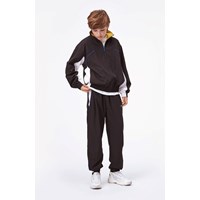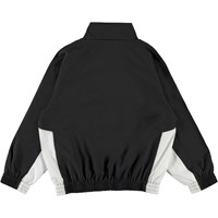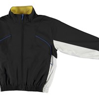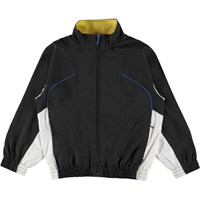 Mewi is een zwarte trainingsjas met witte details aan de zijkanten en blauwe biezen. De jas heeft een hoge kraag, ritssluiting en elastische ribboorden aan de mouwen en onderkant. Draag de jas met bijpassende short of broek.