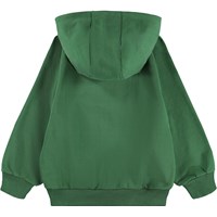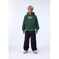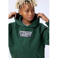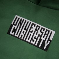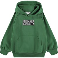 Groene hoodie gemaakt van biologisch katoen met een buidelzak en ribboorden rond de mouwen en taille. Deze hoodie heeft een zwart/witte print met de tekst ''Universal Curiosity''.