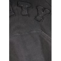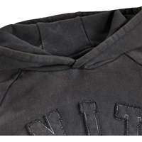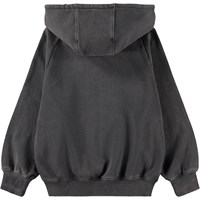 Grijze hoodie gemaakt van zachte, biologische katoen met ribboorden rond de mouwen en onderkant. De hoodie heeft een zeer ruime en relaxte pasvorm met een kangoeroezak aan de voorkant en de tekst 'Unity'.