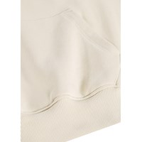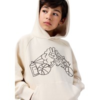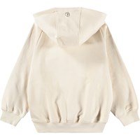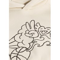 Beige hoodie gemaakt van zachte, biologische katoen met ribboorden rond de mouwen en onderkant. De hoodie heeft een zeer ruime en relaxte pasvorm met een kangoeroezak aan de voorkant en een speelse en leuke geborduurde print.