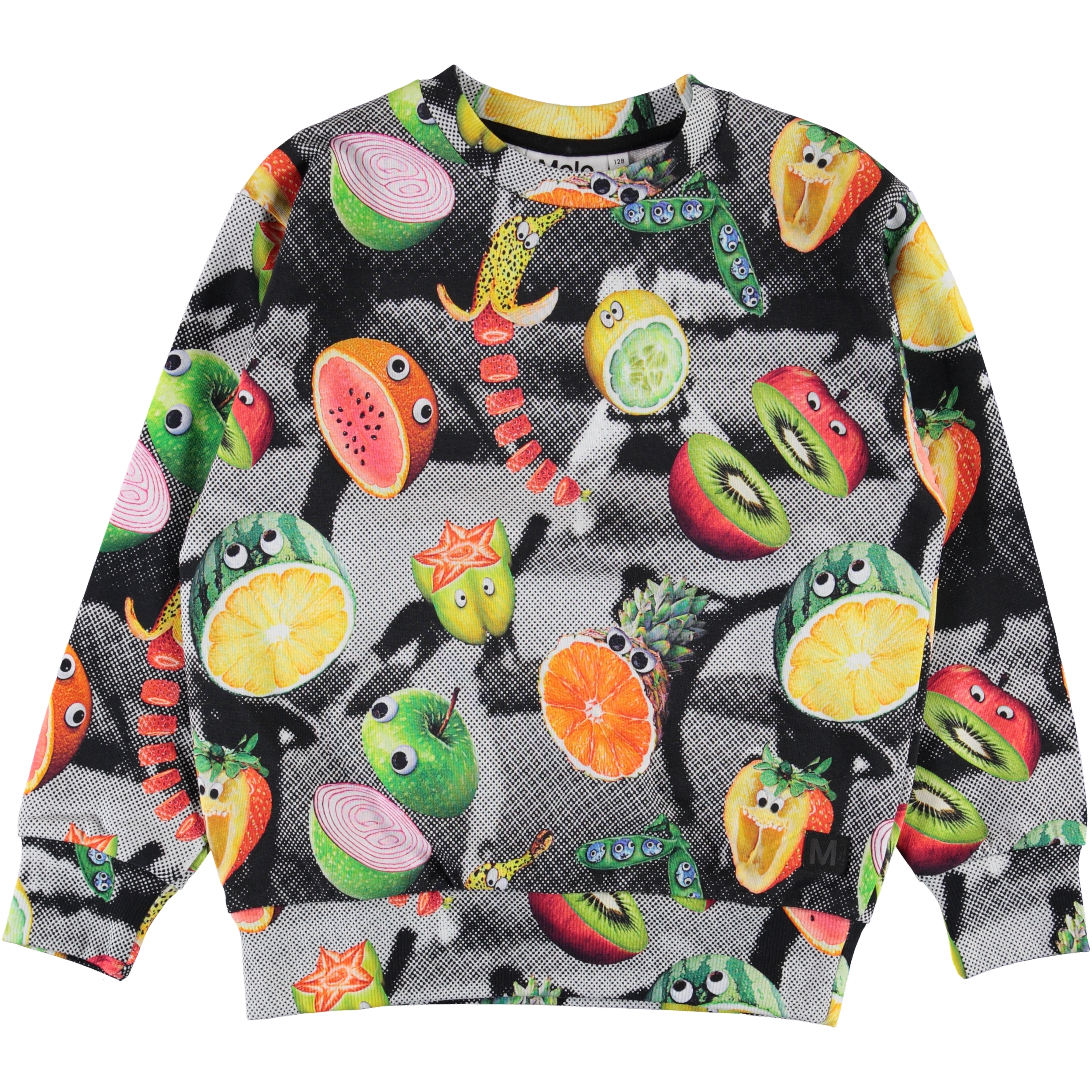 Je weet niet altijd wat zich onder de schil verstopt. Bekijke deze prachtige vruchten op Molo's 'Karate fruit’ print op de Mik trui.