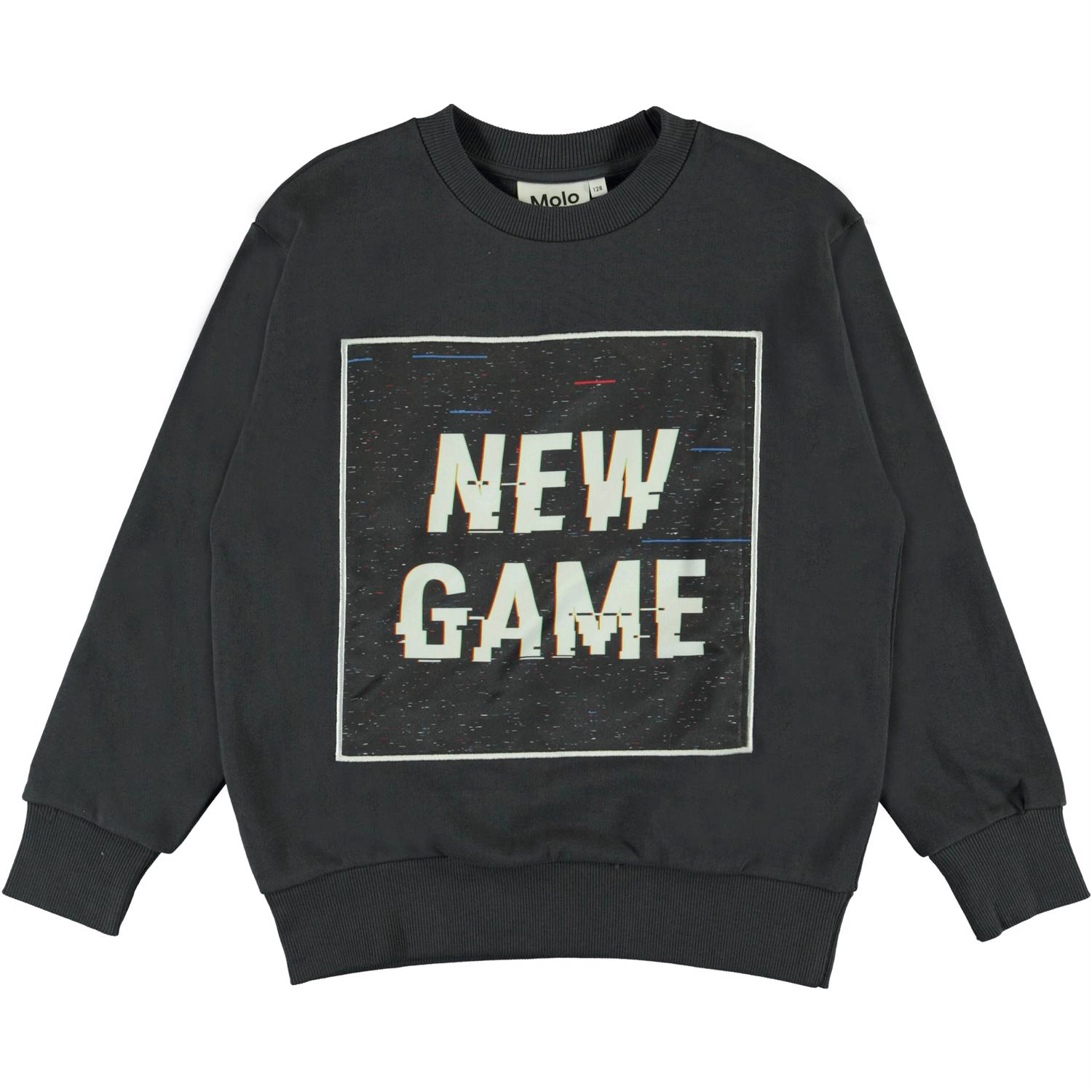Mik is een zwart trui met opgenaaide print op de voorkant met de tekst 'New game'.