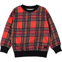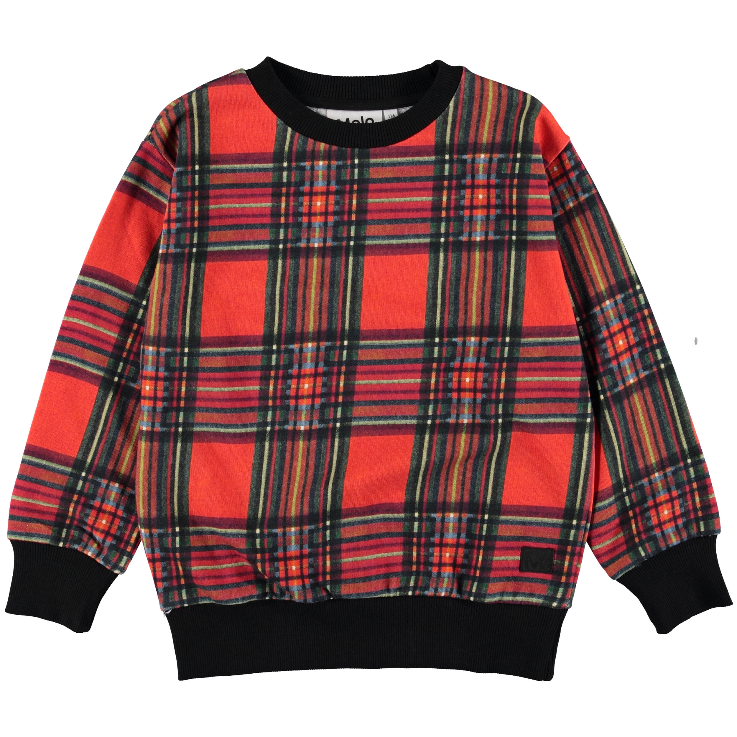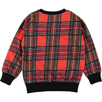 Mik is een katoenen geruite trui met een rode achtergrond en zwarte rib aan de hals, onderkant en mouwen.