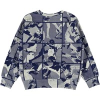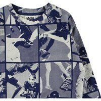 Mik is een blauw trui met sportafbeeldingen verdeeld in verschillende blokken die een mooie print creëren.