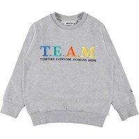 Mike is een grijs trui met op de voorkant een ‘Team’ borduurwerk in verschillende kleuren.