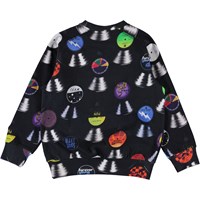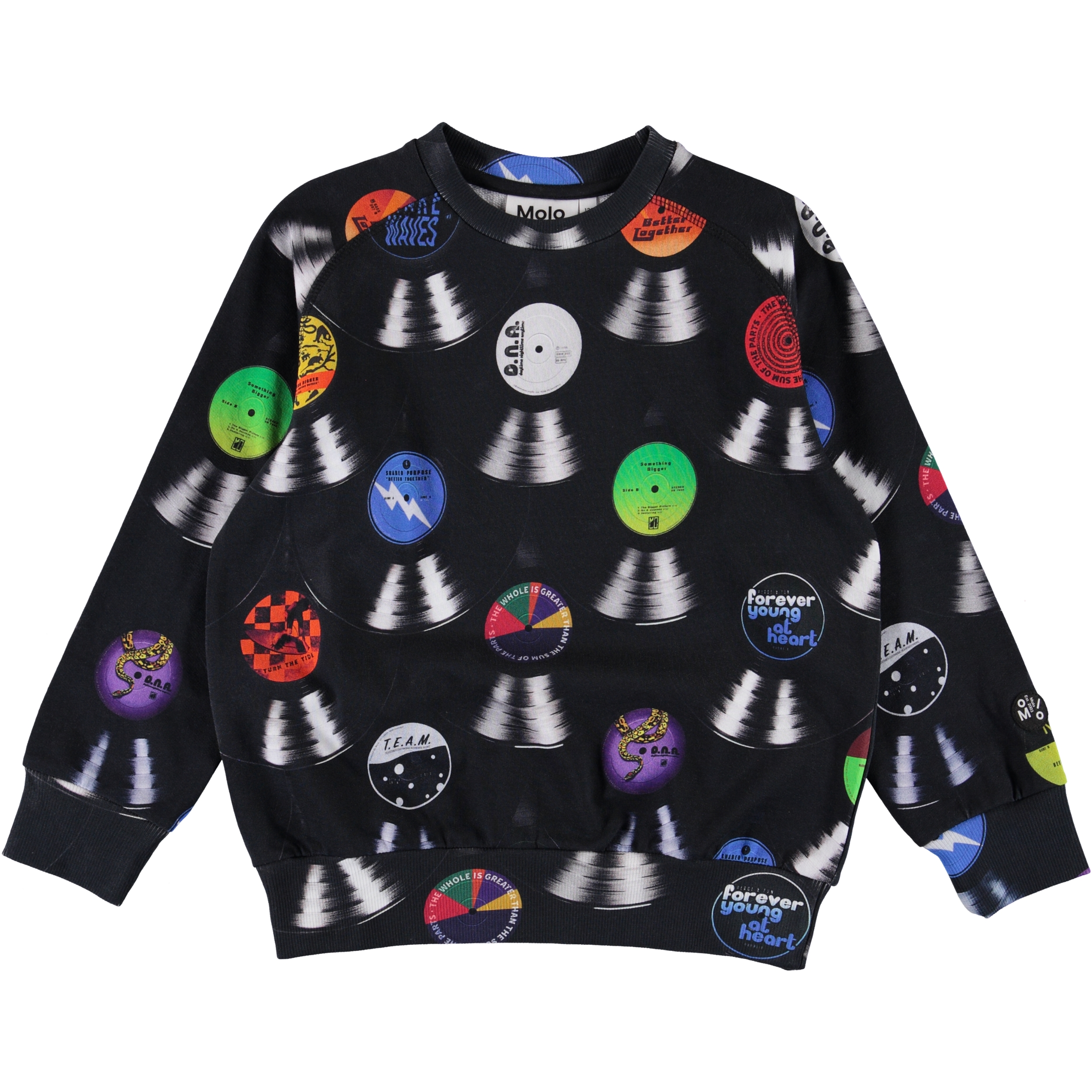 Mike is een zwart trui met een print van verschillende LP’s met Molo's universum. Mike is 100% katoen.